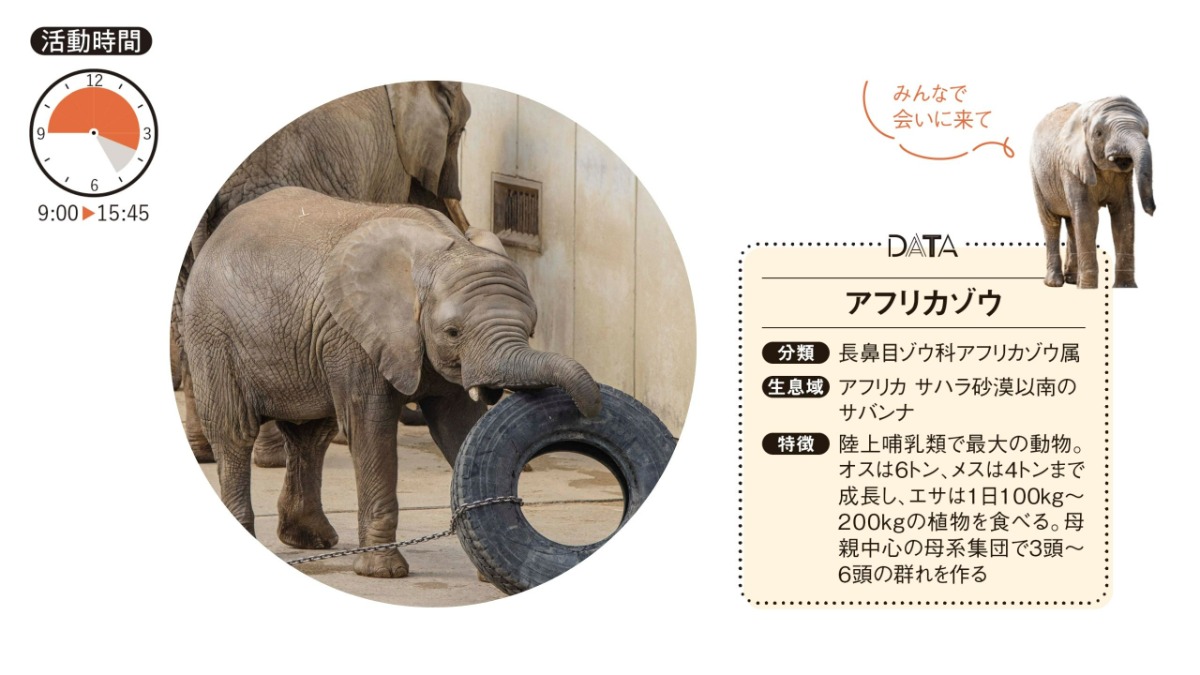 母親の「リカ」と姉の「媛」と一緒に、9:00~15:45は運動場で活動している。エサの時間は9:00、11:30、13:30頃の計3回。15:45以降は獣舎内に入ると見ることはできないが、姉の「媛」は室内展示場で見ることができる。