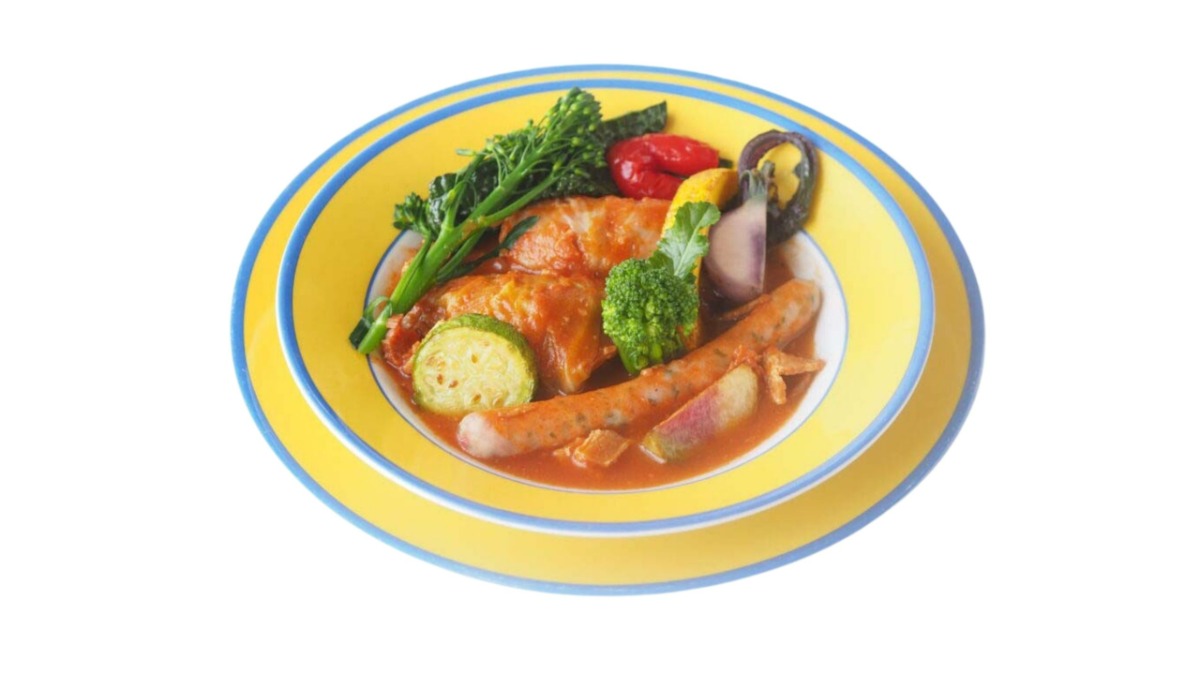 モネの絵画のような色とりどりの野菜を添えた一皿。スープ、サラダ、パンor ライス付き。