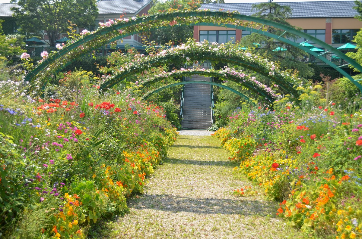 まるでモネのパレットのようにカラフルな草花が植えられた庭。バラのアーチやノルマン囲いの造形は、絵画の世界に飛び込んだかのよう。5月に咲くバラは200種500本! 開花状況はSNSで確認しよう。