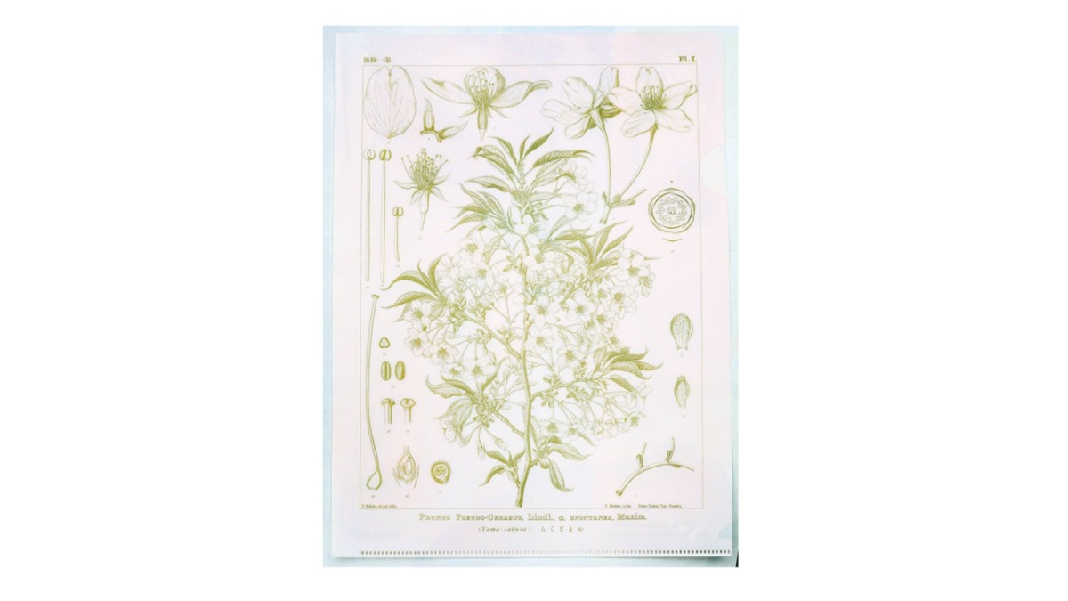 牧野博士が書いた繊細な植物画をクリアファイルにしたもの。写真の商品は「ヤマザクラ」。