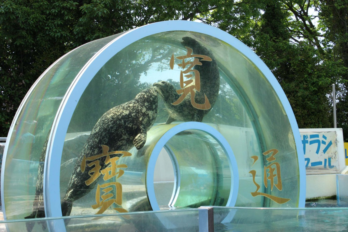 「新屋島水族館」のゼニガタアザラシはとにかく多才! 日本に2つしかないご縁水槽(水面上にあるドーナツ型水槽)で演技をしたり、仲良く相合傘をさしたり、あっと驚く姿を見ることができるので写真撮影を忘れずに!