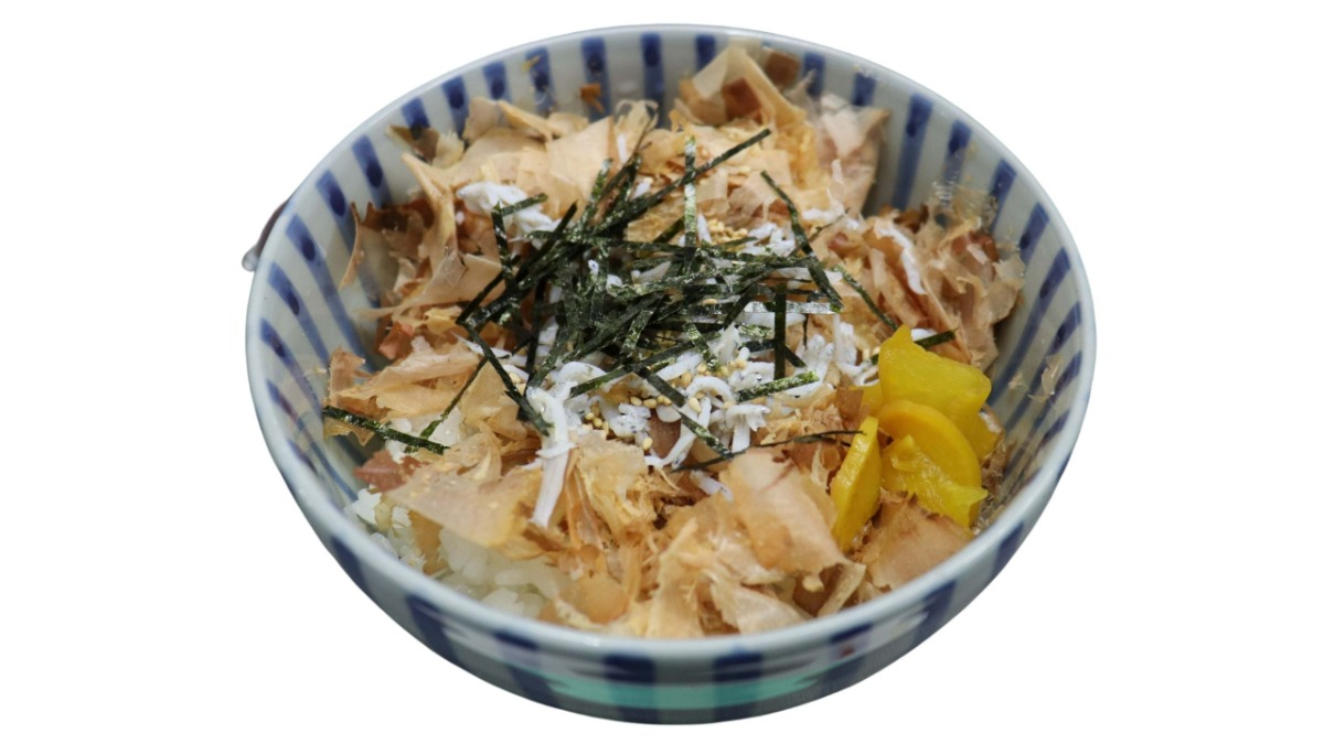 花かつお、ちりめんじゃこ、刻みのり、好みでわさび醤油をかけて食べる漁師のまかない丼。