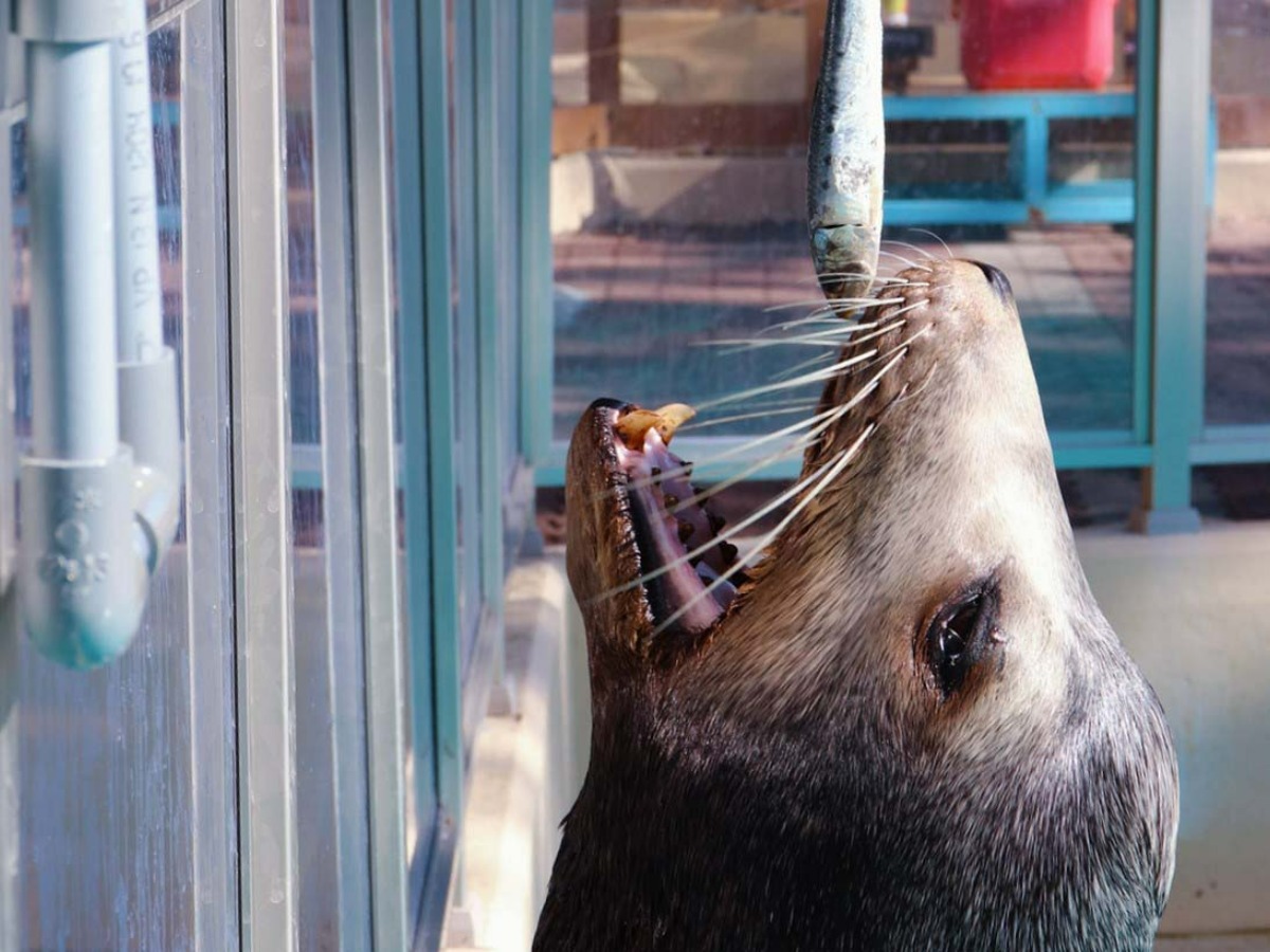 トドやアシカにトングを使って魚をあげることができる(1匹100円)。エサやりを通して、それぞれの違いを見て学ぼう!