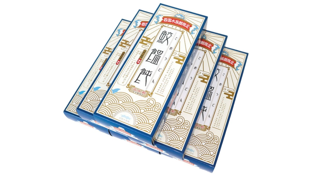サメ軟骨エキスを練り込んだ「四国水族館」オリジナルの讃岐うどん。おみやげにおすすめ!※ 1 箱2 人前、つゆ付き