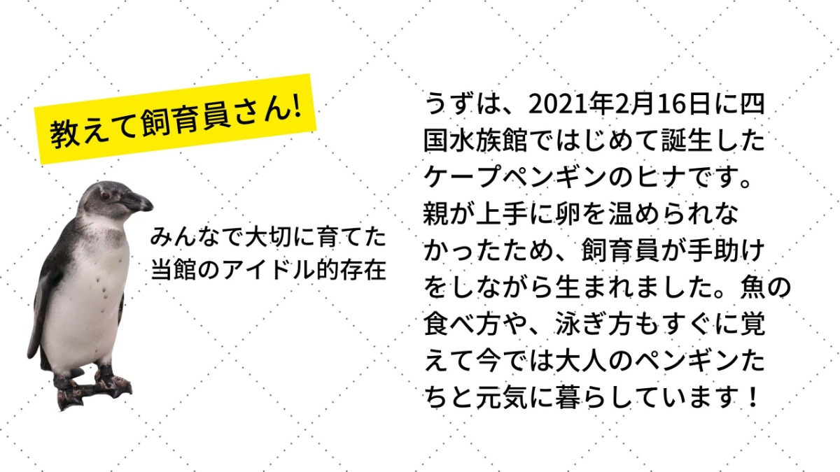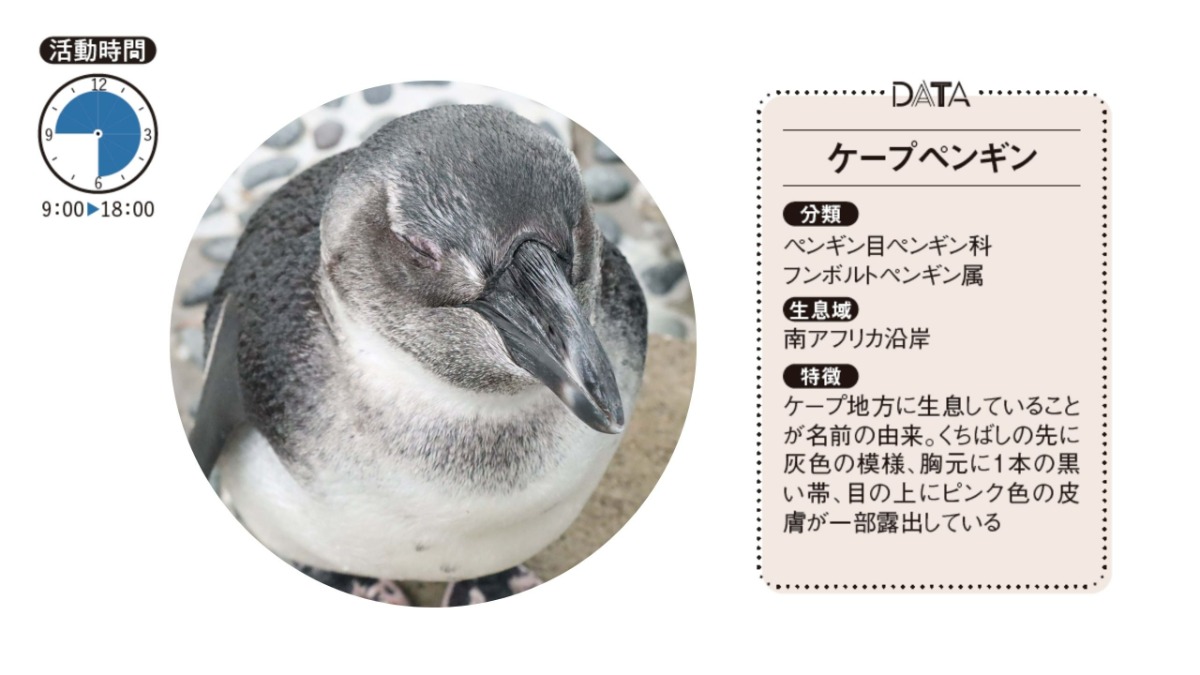 好奇心旺盛な性格で、個性豊かな大人のペンギンたちとも一緒に泳いだり、食事をしたりして仲良く暮らしている。日中の明るい時間に活発に動くことが多い