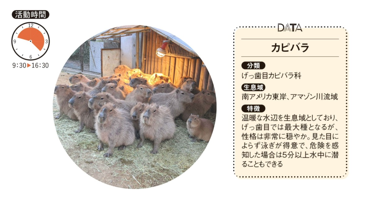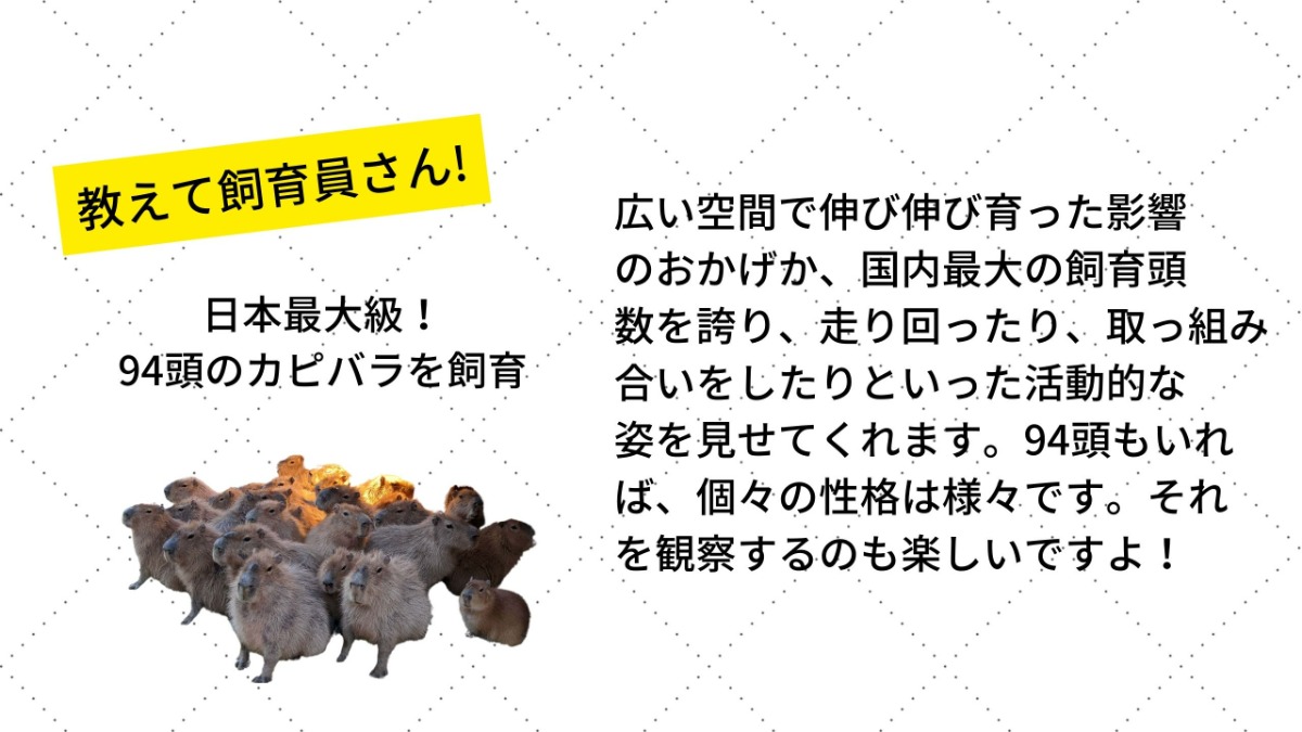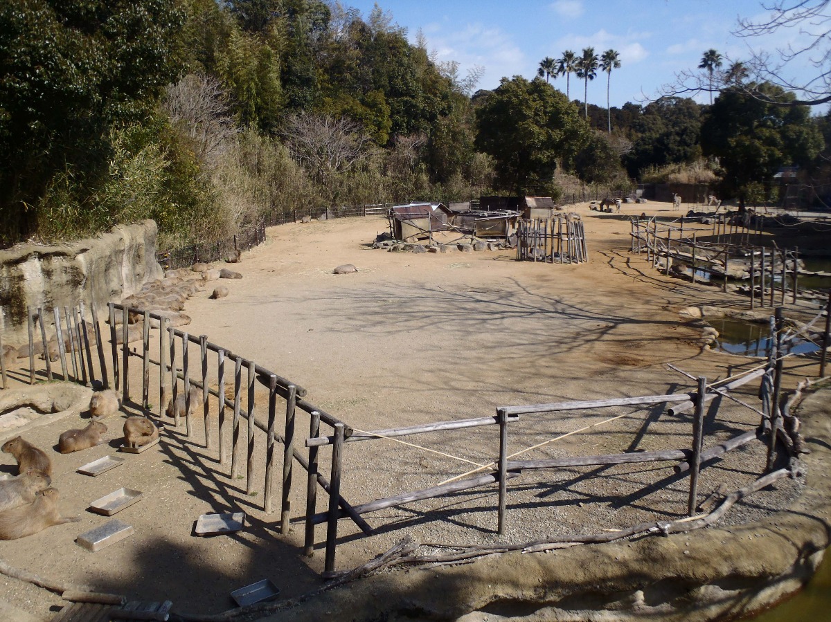 大小様々な動物を広い空間で一緒に飼育展示する混合飼育を行っている。正確にはサバンナの動物ではないけれど、ここでカピバラの展示も行っており広い空間で伸び伸び育った影響か、国内最大の飼育頭数!
