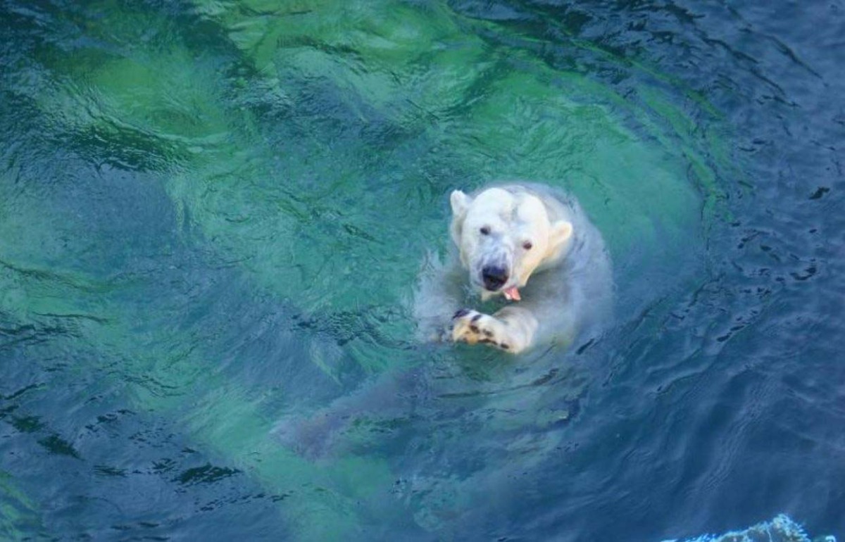 ホッキョクグマが氷めがけてプールにダイブする迫力ある飛び込みシーンが見られる!(開催は4〜9月末まで)