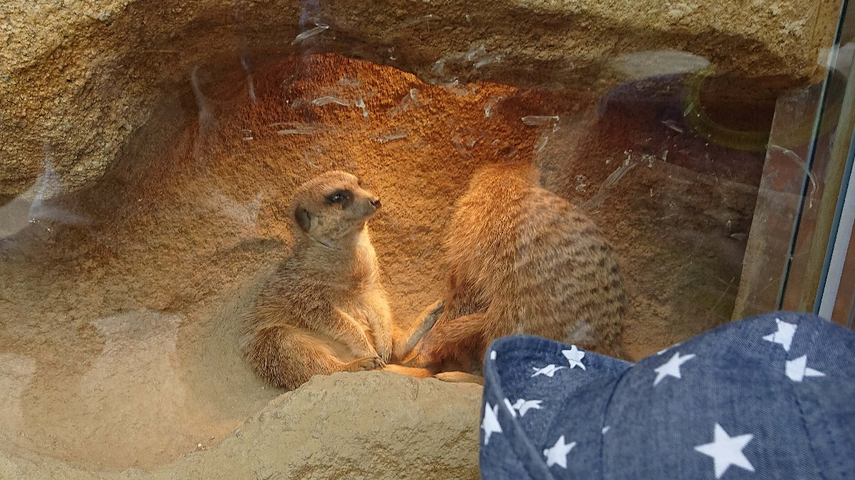 2019年に新設されたミーアキャット舎。スケルトン展示で地下の巣穴が見えるような工夫がされている。自然界と同じように穴と地上を行き来するミーアキャットの様子がガラス1枚隔てただけの距離で観察できる。