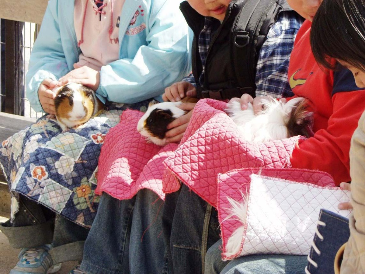 ふわふわとしたモルモットを膝の上で抱っこできる。小さな動物とのふれいあいで命の大切さを学ぼう!