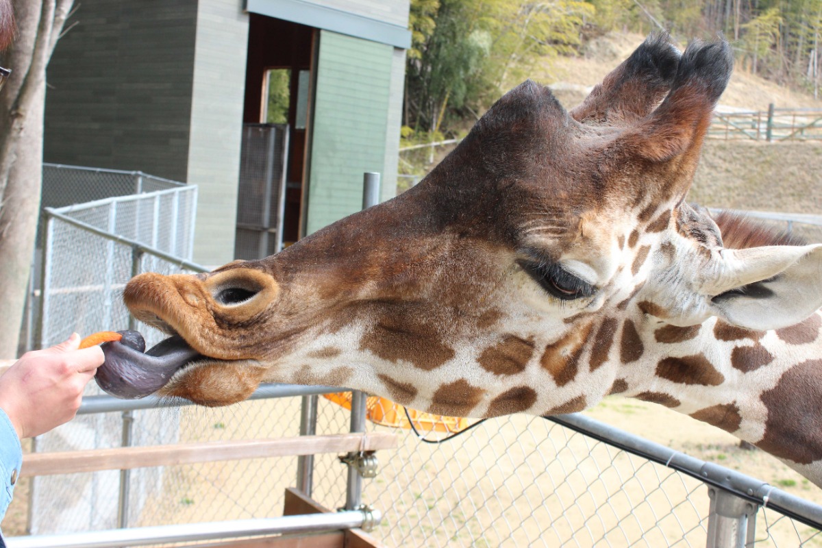 キリンのモモタ君に間近でごはんをあげることができるイベント。どんな食べ方をしているか観察してみて。