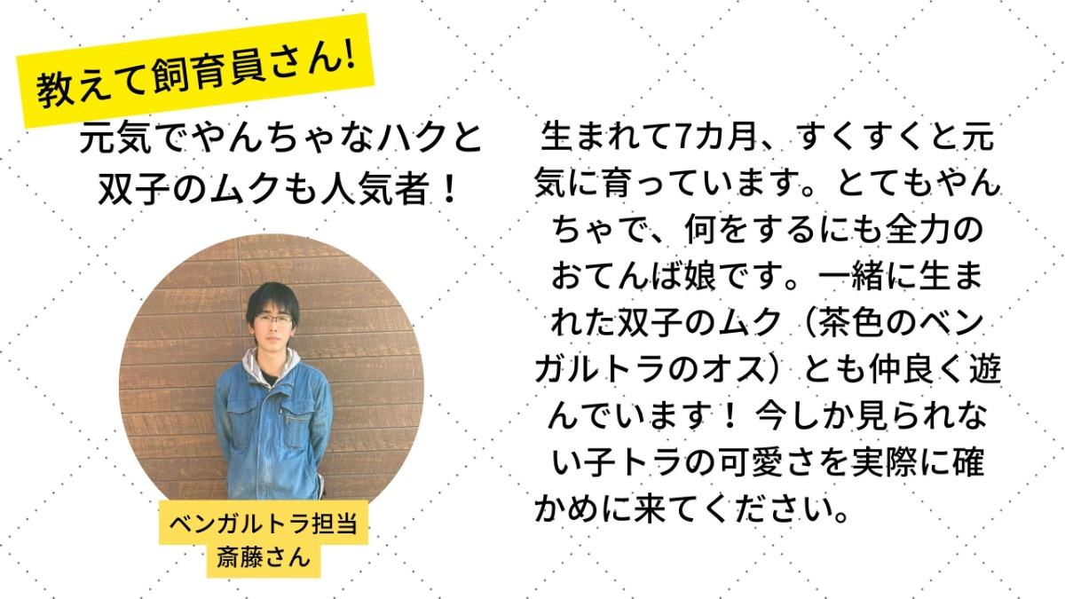 2021年9月に誕生したホワイトタイガー(ベンガルトラ)のハク。白ベースに黒の縞模様、目は薄い青色。イベントタイムの後は昼寝をしている様子を見ることができる。