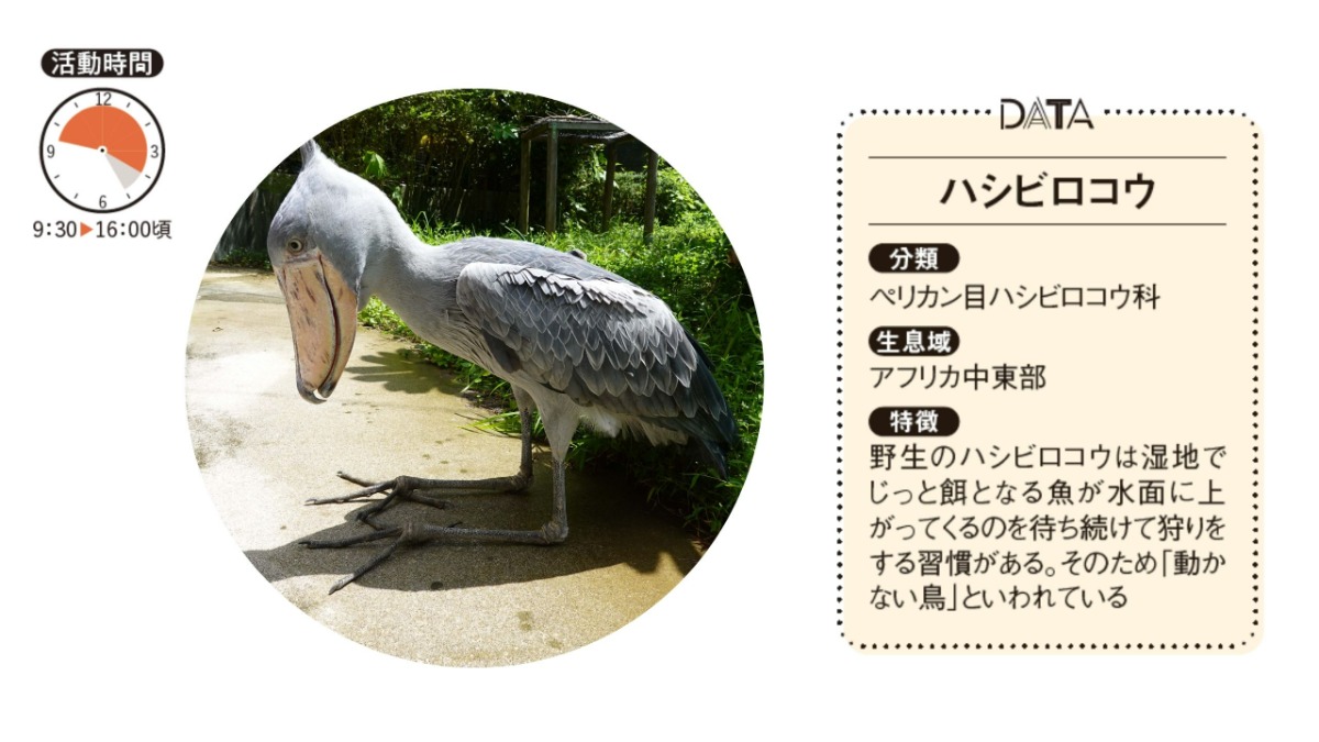 一般的に「動かない鳥」といわれるハシビロコウだけれど、「ささ」はよく動く行動派。ネットの近くまで来て来園者をじっと観察していることもあるが、やっぱり動かない時間も長い。