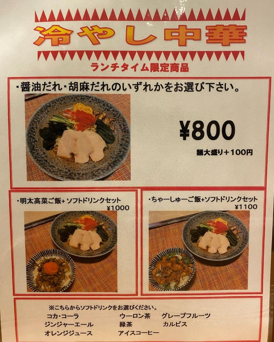 ソフトドリンクと「明太高菜ご飯」もしくは「ちゃーしゅーご飯」のセットメニューもあるので要チェック。