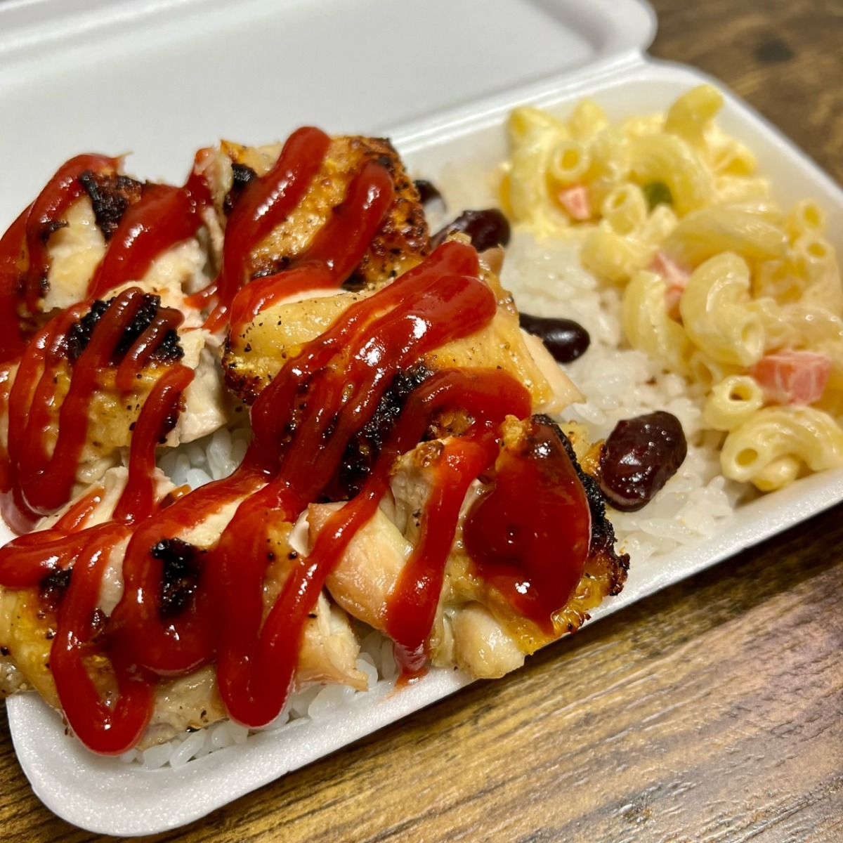 ジャークチキンとご飯、マカロニサラダのボリューム満点な店主イチオシセット。なんと、ご飯大盛りは無料! 子どもや少食の人にもピッタリなハーフサイズ(450円)も。