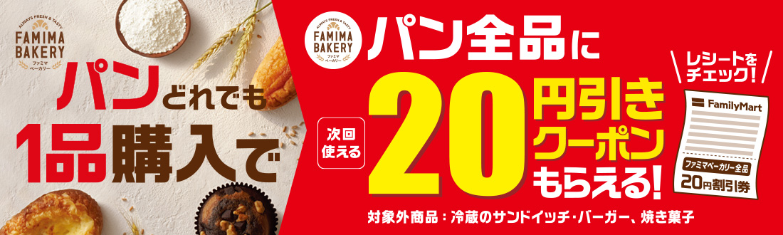 「FAMIMA BAKERY(ファミマ ベーカリー)」のパンどれでも1品購入で、「FAMIMA BAKERY(ファミマ ベーカリー)」のパン全品に次回使える、20円引きクーポンもらえる! ※沖縄県では実施しておりません。