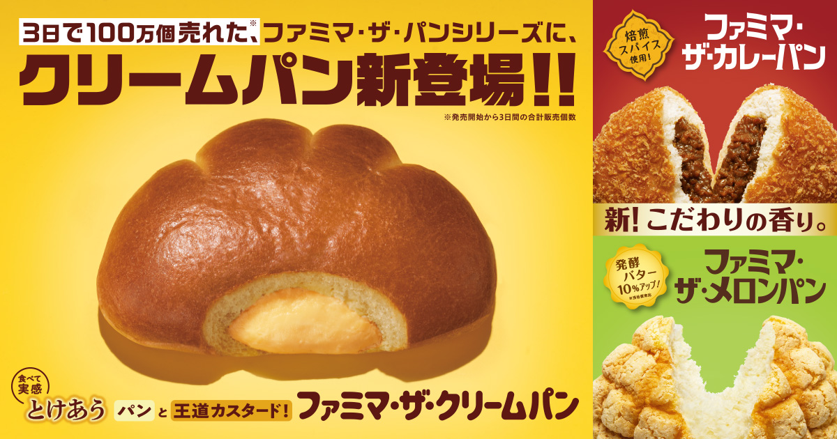 ファミリーマートオリジナルパンブランド「FAMIMA BAKERY(ファミマ ベーカリー)」の3日で100万個(※)売れた人気の「ファミマ・ザ・パンシリーズ」から、『ファミマ・ザ・クリームパン』が新登場!さらに、『ファミマ・ザ・メロンパン』と『ファミマ・ザ・カレーパン』も美味しくリニューアル!