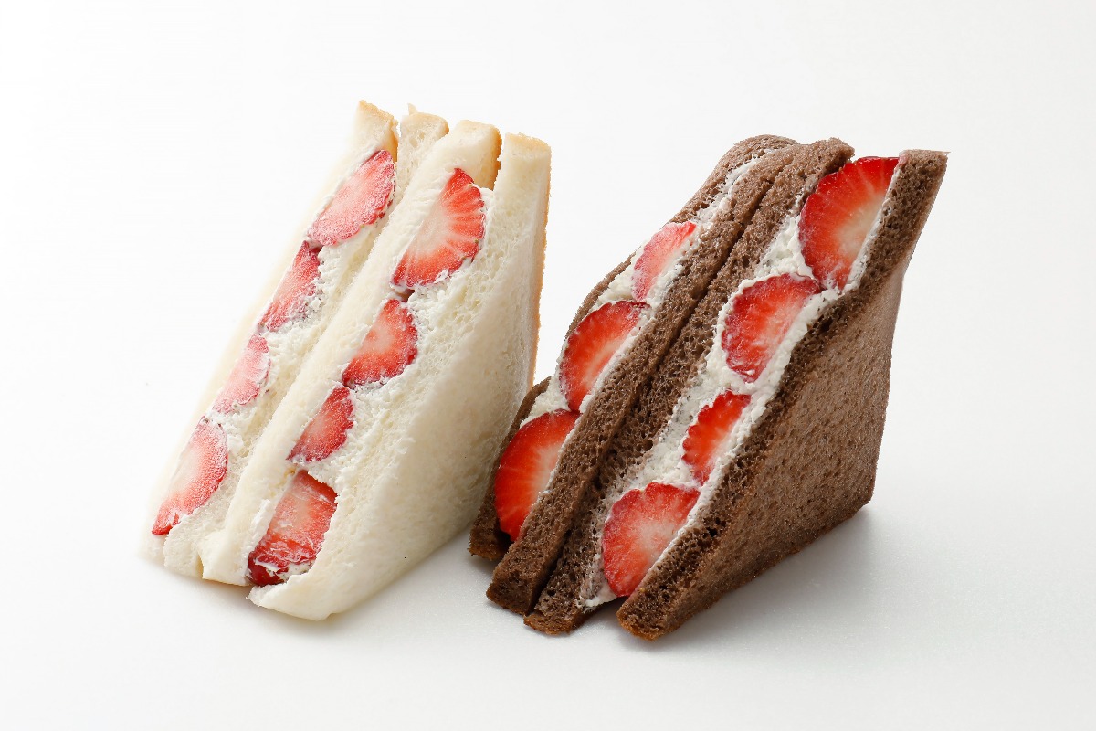 プレーンとチョコレートの食パンに、北海道産生クリームと愛媛の紅ほっぺをサンド! 5月頃までの期間限定商品。売り切れの場合もあるのでお早めに!