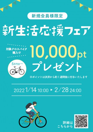 キャンペーン期間中に対象クロスバイクをご購入&ワイズクラブ会員に新規本登録をされた方に10,000円分のポイントプレゼント!