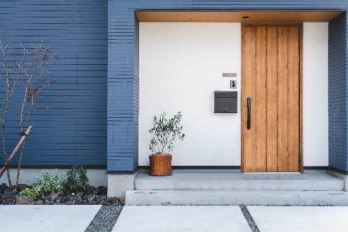 ネイビーの外壁に白い塗り壁の玄関ポーチがアクセントになった外観。玄関横の植栽が、四季折々の異なる表情で楽しませてくれます