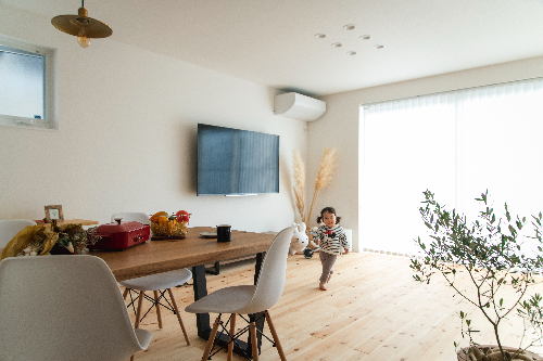 足触りが良く、木のぬくもりを感じられる無垢材が家族をやさしく包み込みます。壁は白を基調とし、清潔感と開放感のある空間となりました