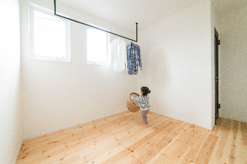 2階に設計されたランドリールーム。天気に左右されることなく洗濯物を干すことができ、生活動線を2階にすることですっきりと暮らせます