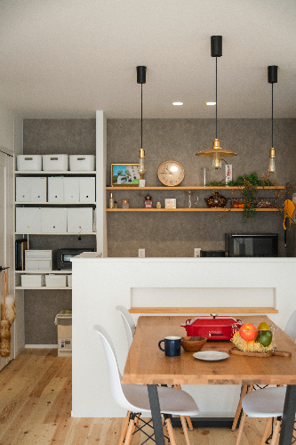 日用品や家電を置く可動棚やインテリアやグリーンを置く造作棚を設け、Tさまファミリーの生活スタイルに合った空間づくりが完成しました
