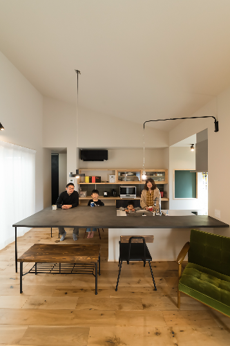一体化したキッチンカウンター&ダイニングテーブルを造作。後ろの壁には家族のコミュニケーションツールとなる黒板ボードも設置しました