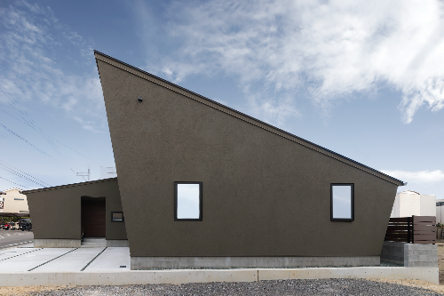 ナナメのラインで構成された外観が不思議なKさま邸。中庭を真ん中に、玄関から真っすぐ進めばLDKと和室のパブリックスペース、左側にはシューズクロークから洗面室、キッチンへと続く回遊動線で暮らしやすさ抜群です。
