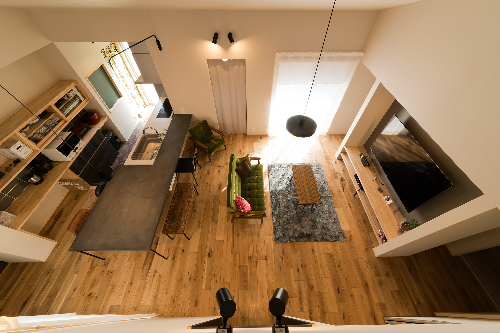 ロフトから見下ろすLDK。冬は暖房ひとつで邸内全体がポカポカ。床暖房ではありませんが、無垢材の床なので足触りがすべすべであったかい