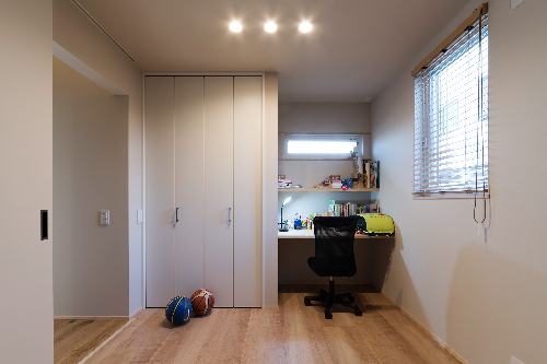 リビングのテレビボードの裏には、子ども部屋を左右対照に2つ配置。勉強机もクローゼットも造り付けで、余計な家具を置かずシンプルに
