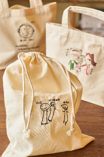 子どもが描いた絵などを刺繍できる「丸栄刺繍」コラボのポーチやトートバッグが人気!イベントも随時開催中の他、店頭での注文も可能。詳しくは問い合わせを。