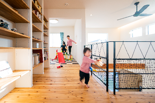 吹き抜けでつながる2階ホールはお子さんの遊び場として活躍! 子ども部屋にはあえて扉をつけず、レイアウトの工夫で緩やかに隔てています