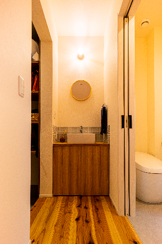 玄関から土間収納を抜けたところに洗面台をレイアウト。お子さんも帰宅したら、まず手洗いやうがいをする習慣が自然と身にきます
