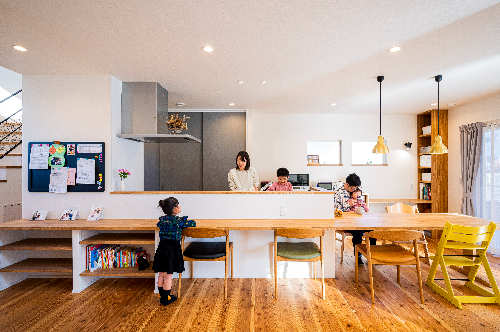 キッチンカウンターからダイニングテーブルまでつながる一枚カウンターを造作。家族で食卓を囲んだり、勉強したり、みんなで活用しています