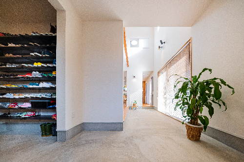 リビングとつながる土間スペースと別に、玄関を入って左には収納をたっぷり確保した家族用のプライベート土間を配置しました