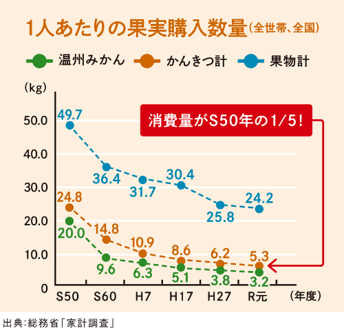 日本にはたくさんの果物が栽培されていますが、国内の消費量は年々減っています。特に温州みかんをはじめとしたかんきつの減少幅が大きく、このままでは生産量もどんどん減ってしまいます。