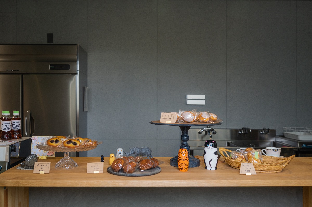 焼き菓子の合間から覗く、猫好きの村上さんが選んだ可愛い猫雑貨にも癒やされます。