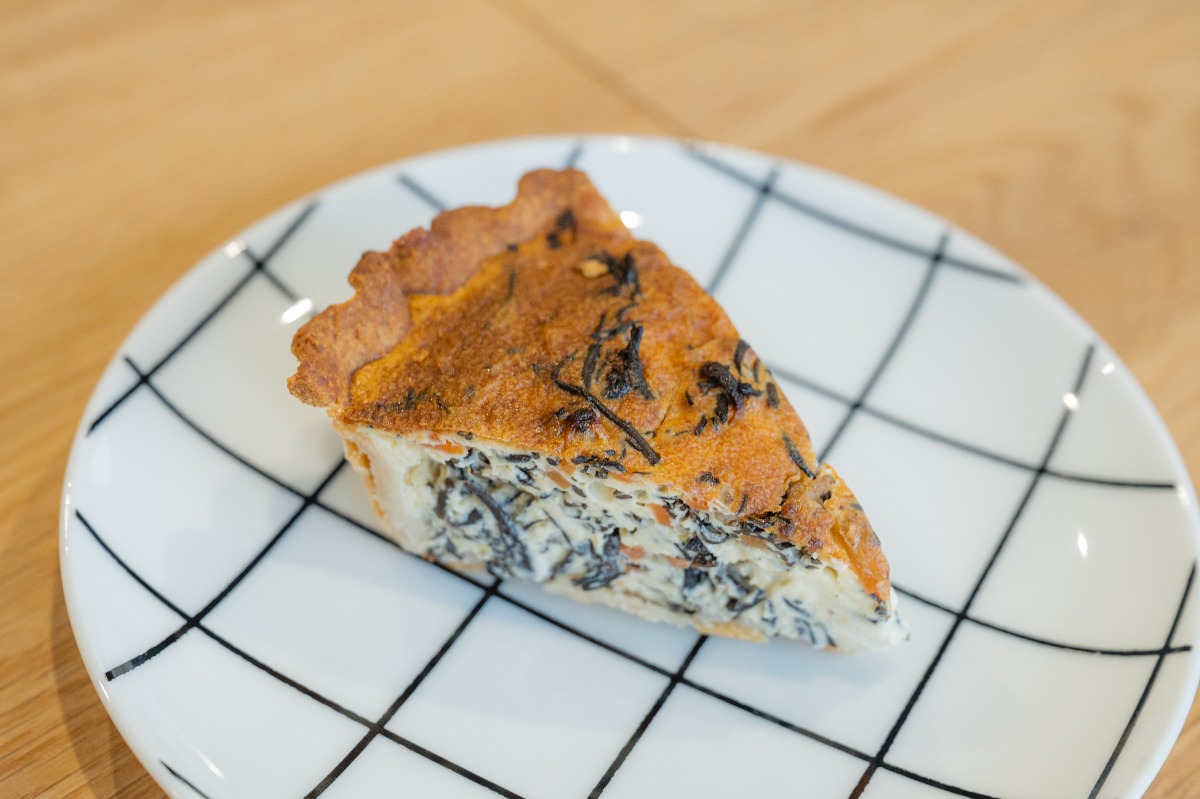 人気メニューは、亀老山で販売しているヒジキを使ったキッシュ。少し固めに湯がいたヒジキをたっぷりと使用しているため、シャキシャキとしたヒジキの食感を感じられます。