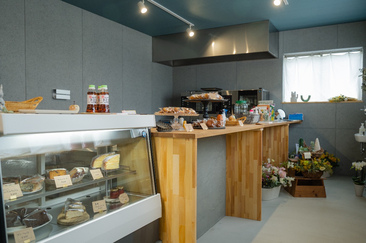 ご両親が昔焼き鳥屋をしていた建物を一部改装。落ち着いた配色のスタイリッシュな雰囲気で、カウンターとショーケースに商品が並んでいます。
