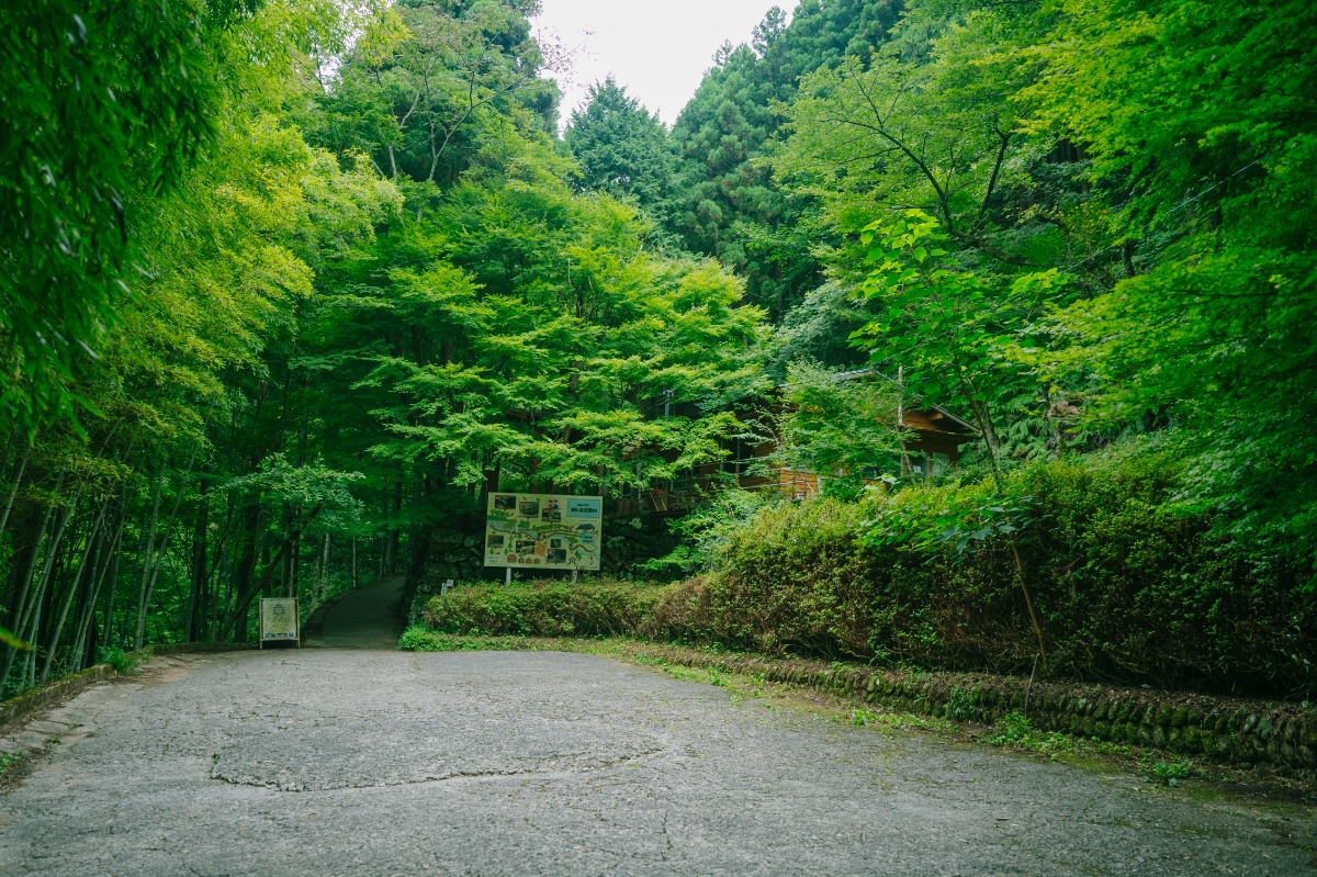 標識に従って、東温市明河の山道をグングンと車で進んでいくと、少し広い駐車場に到着します。ここに車を停めて、遊歩道を歩いて進んでいくのですが、それが冒険に行く気分でワクワクします。