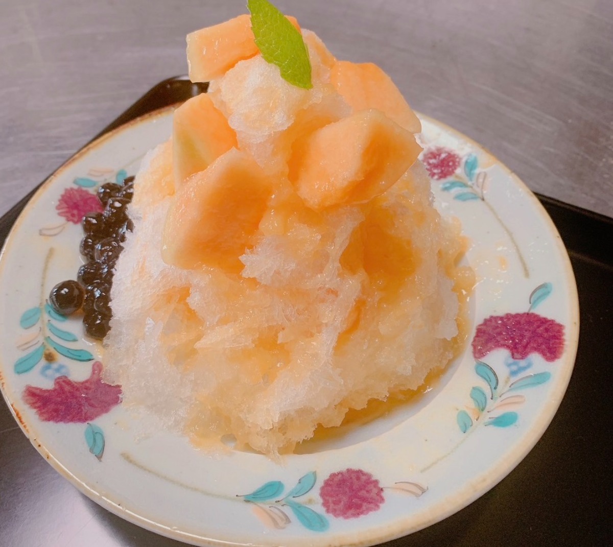 ゴロゴロと果肉が入った、食べ応え十分なかき氷。素材の味わいをふんだんに生かし、練乳との相性も◎。