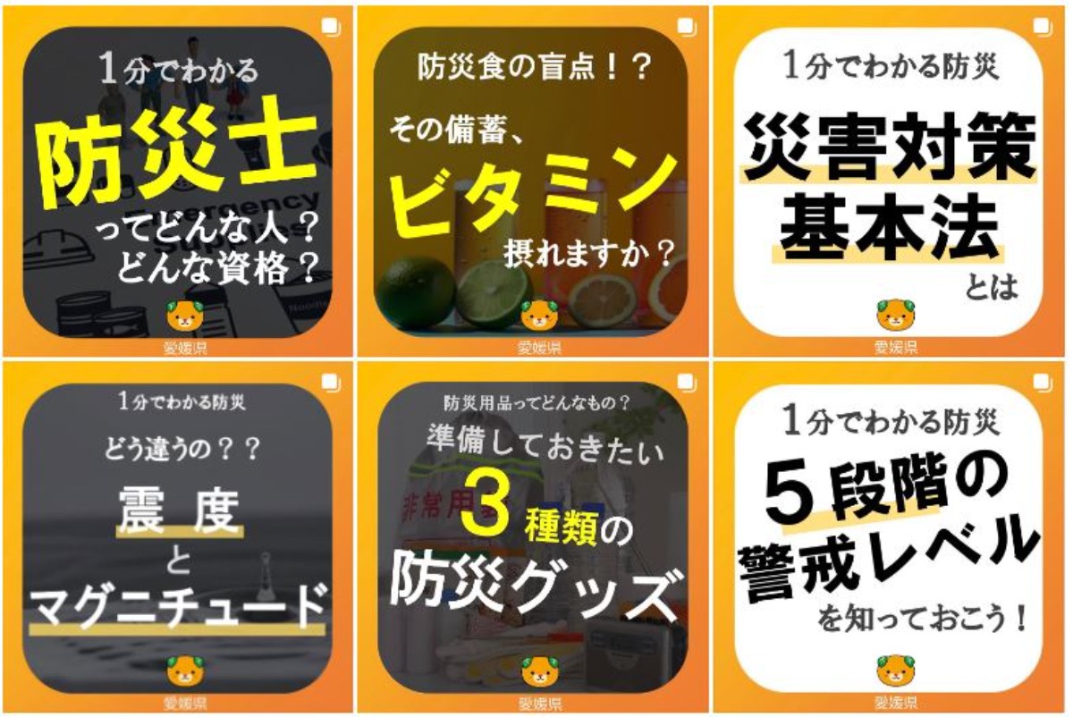 地震、津波、風水害など、いつどこでどんな災害に遭うか分かりません。愛媛県では、災害・気象用語の解説や備蓄品準備のポイントなど、すぐに役立ち"1分でわかる" 防災知識をInstagramで投稿しています。今すぐフォローして、まずは、身の回りのできることから準備しておきましょう!