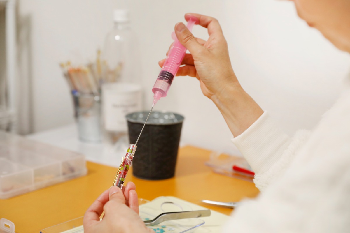 ハーバリウム専用オイルをゆっくり注いでいくとボールペンの中の小さな世界がキラキラと輝きます。