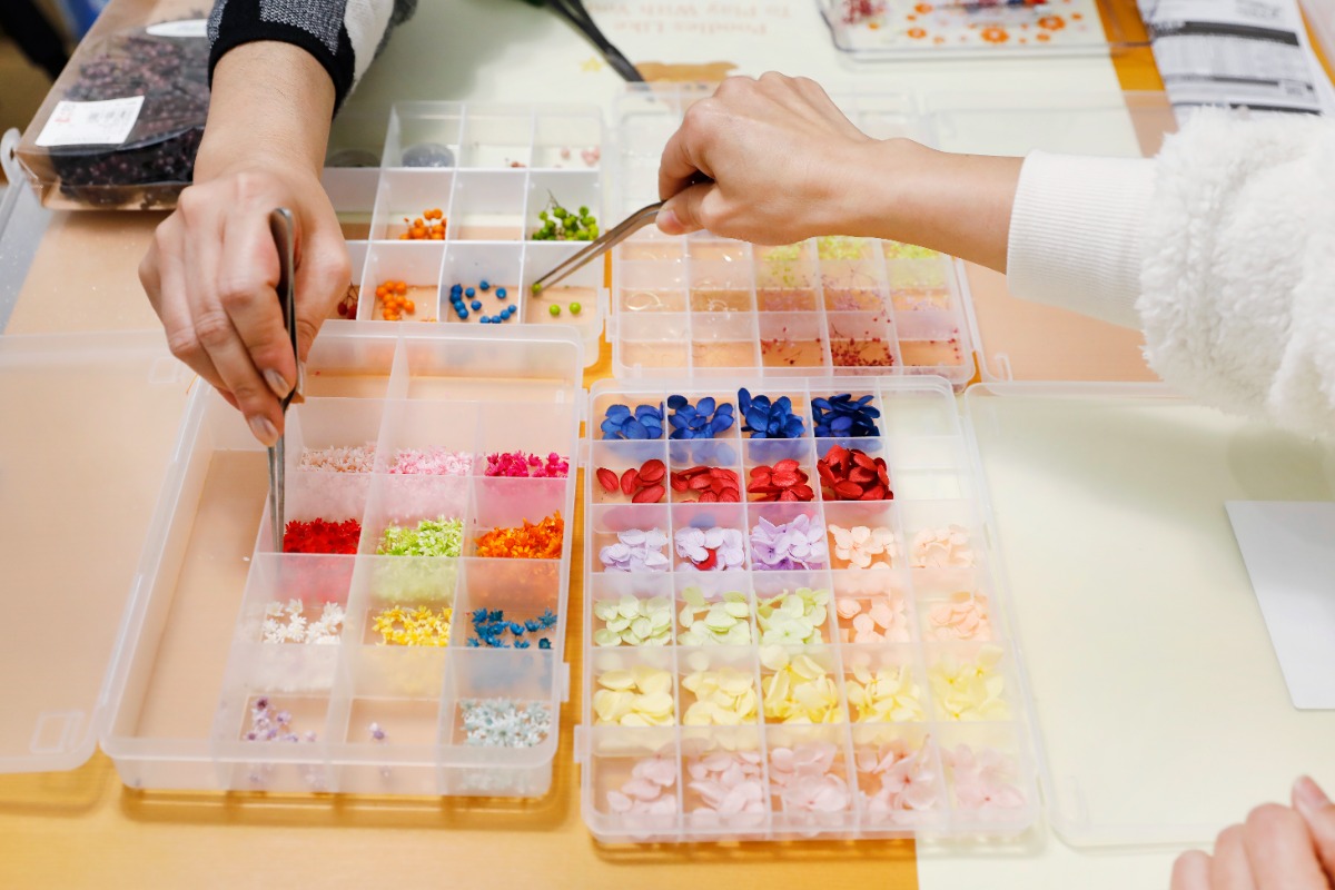 色とりどりのドライフラワーや小さな実、キラキラ光るコイルなど、ペンの中に入れたい素材を色や配置をイメージしながら選びます。選ぶ時間も楽しいものですね。