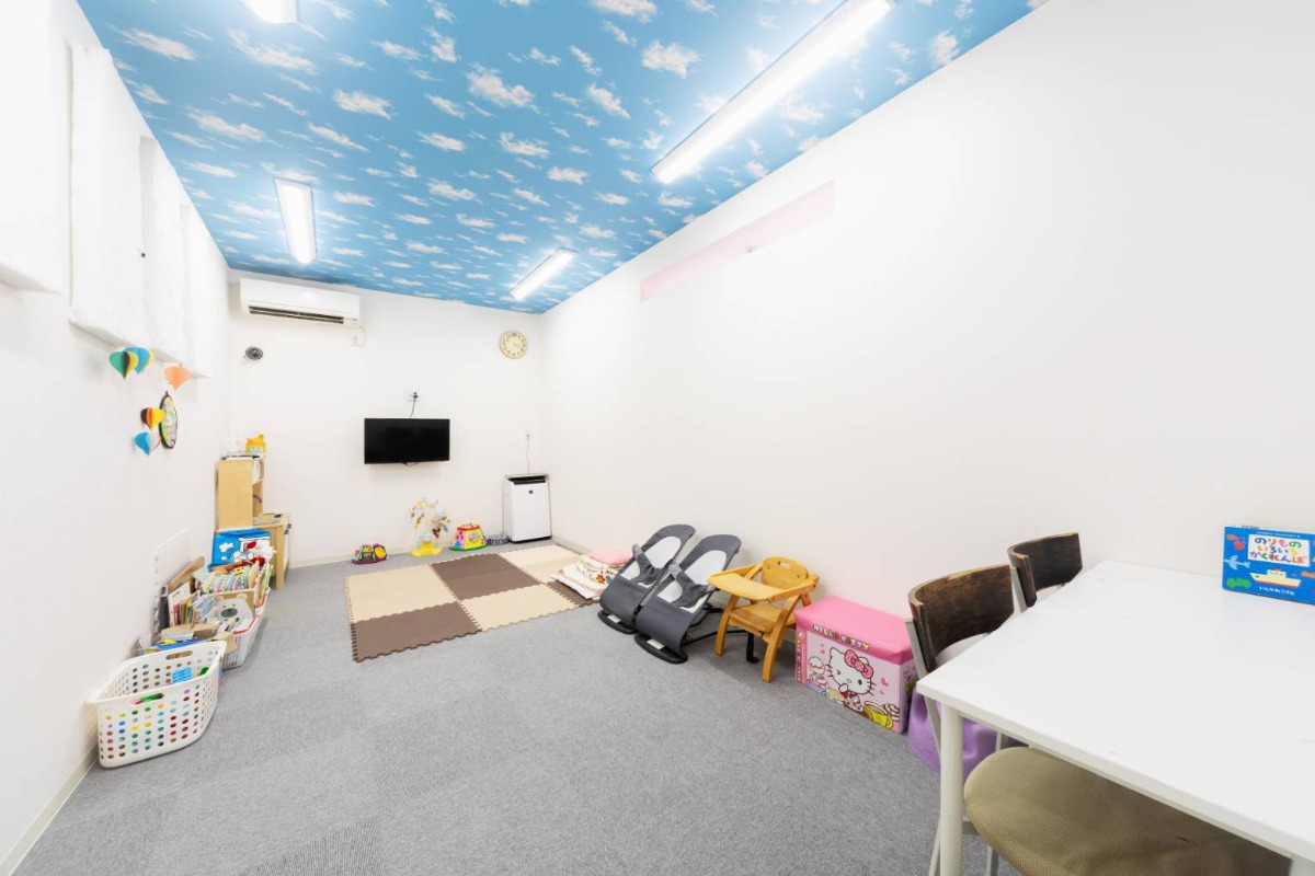 白を基調とした落ち着いた内装の奥には、子連れの方でも安心して来てもらいたいという想いから託児ルームも完備されています。おもちゃや絵本が多数あり、三児のお子さんがいるご夫婦だからこそできる配慮がたくさん。