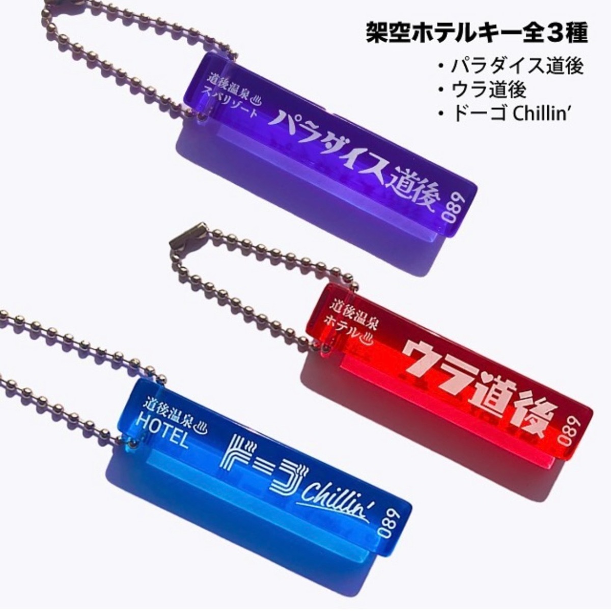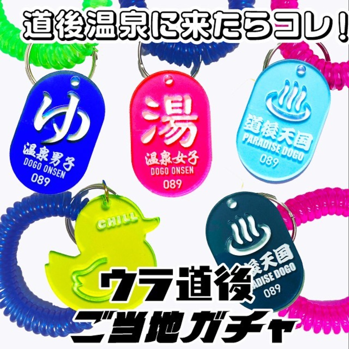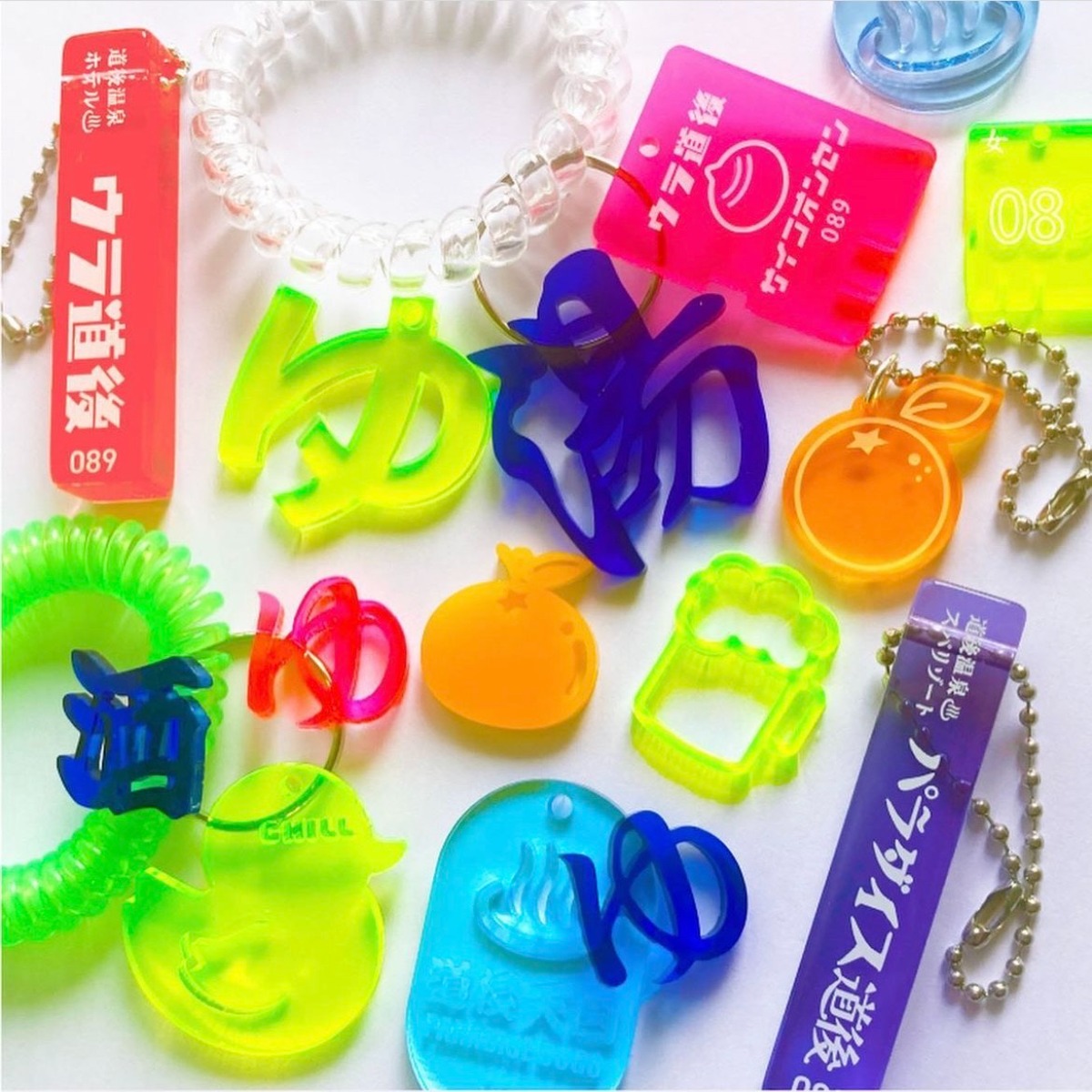 温泉のロッカーキーや架空のホテルキー、みかんなど温泉と愛媛をモチーフにしたネオンカラーのアクリルチャームとなっています。