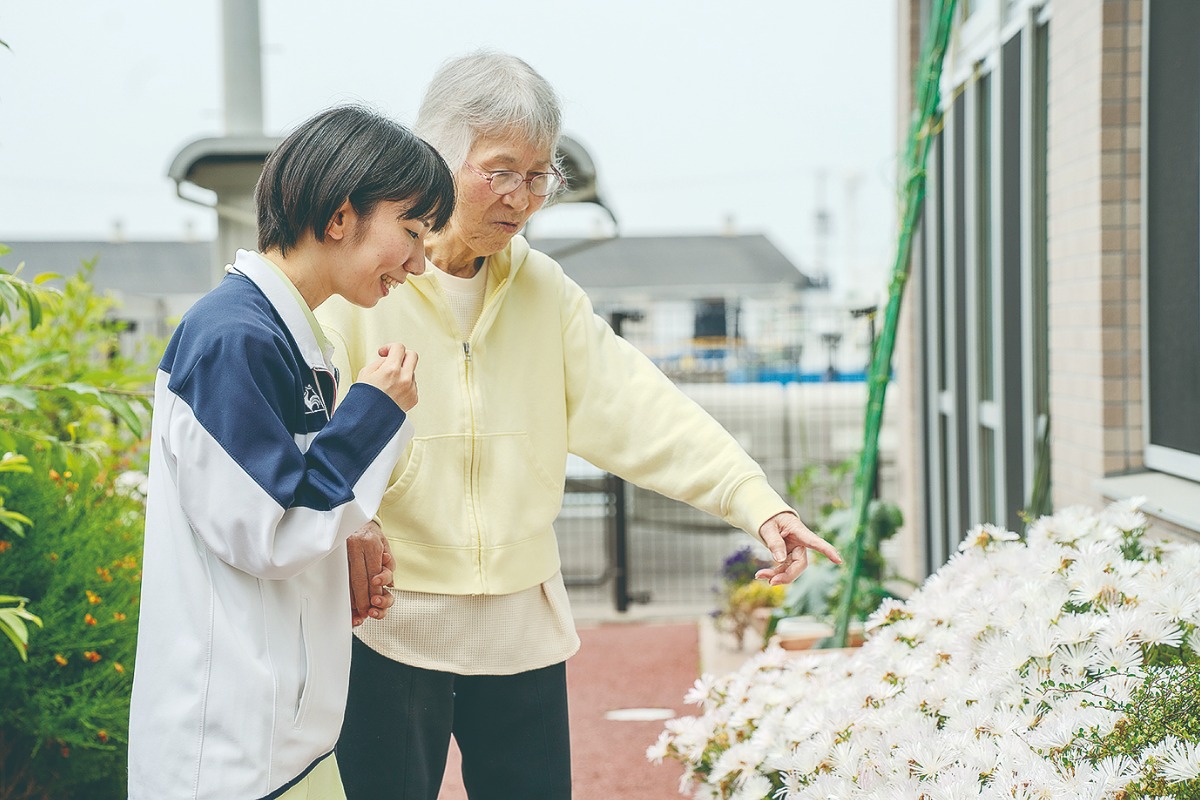 ▲ 福壽さんお気に入りスポットは敷地内の小さなガーデン。花が咲く小道を利用者と一緒に散歩することも
