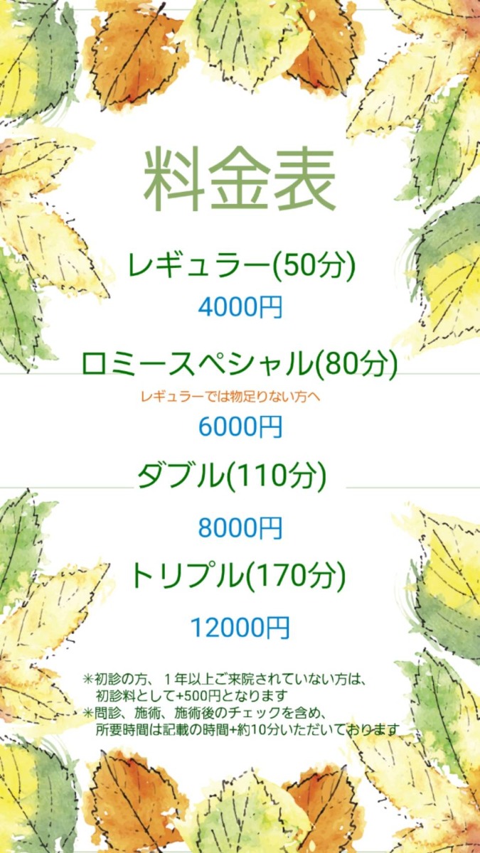 「はり・マッサージ治療院ロミー」では、メニューを選ぶのではなく、50分のレギュラー施術から170分のトリプルまで、施術時間を選ぶのが特徴です。中でも、80分の「ロミースペシャル」を選ぶ人が多いそう。