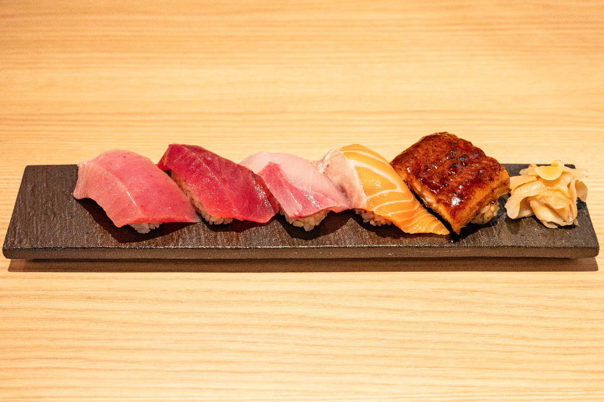 8種類のネタは基本的には「まぐろ・ハマチ(ブリ)・サーモン・あじ・イカ・いくら・ねぎまぐろ・玉子」の8種類です。