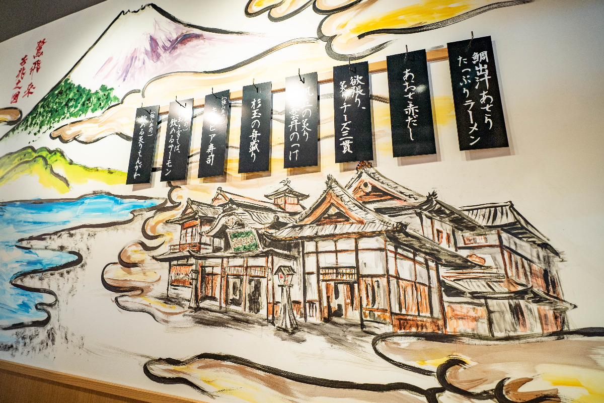 職人が力強く描いた壁画が「杉玉」の見どころのひとつです。JR松山駅の店舗には愛媛のシンボル「道後温泉」も描かれていました!